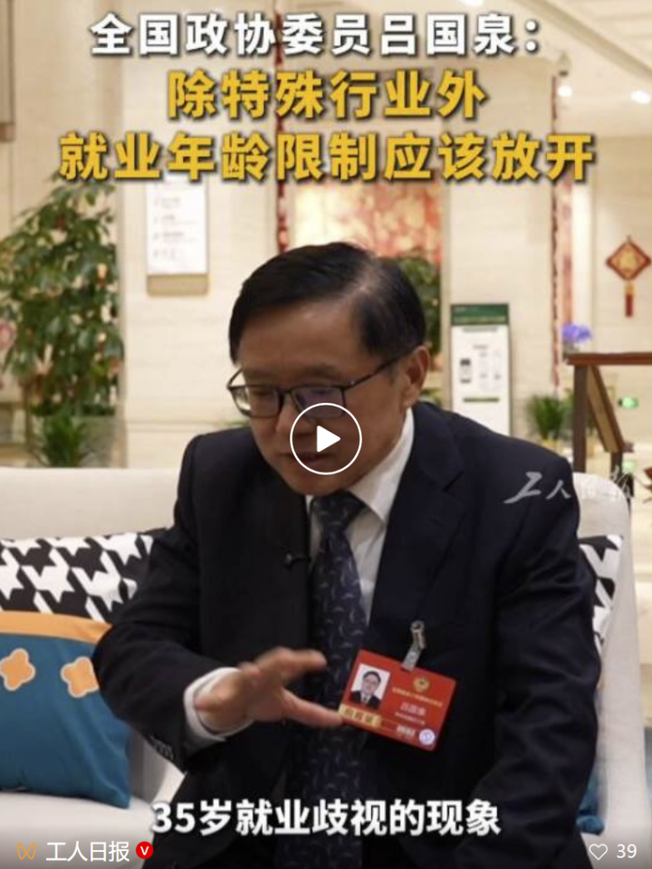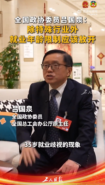 3月5日,@中国新闻网:据工人日报报道,全国政协委员吕国泉表示,“(目前)35岁就业歧视现象应该得到了缓解。”他还称,除特殊行业外,就业年龄限制应该放开。